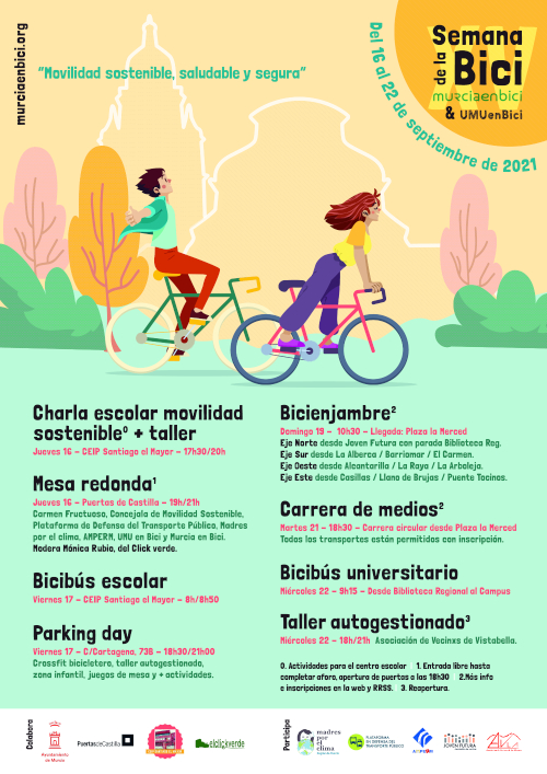 Entre las actividades que se han programado el jueves, 16 de septiembre, a las 19 horas se celebrará en el Centro Cultural Puertas de Castilla una Mesa Redonda con la participación de Carmen Fructuoso, Concejala de Movilidad Sostenible, la Plataforma de Defensa del Transporte Público, Madres por el clima, AMPERM, UMU en Bici y Murcia en Bici. Moderará la mesa Mónica Rubio de Click verde.