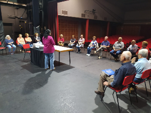 Y es que, desde el taller de patrimonio “Conoce tu localidad” que anualmente programa el Centro Cultural de Beniaján, se ha querido dedicar una de sus sesiones precisamente al Auditorio. Tuvo lugar el pasado jueves, 1 de junio, realizándose de forma extraordinaria en el espacio más emblemático del inmueble: su escenario, el mismo que el día de la inauguración se calificaba como “el mejor de Murcia, tras el del Romea”. Asistieron invitados de excepción como Manuela Sevilla (presidenta de Teatro Edmundo Chacour) y Patricio Barceló (directivo e integrante más veterano de la Agrupación Musical de Beniaján), además de los participantes habituales del taller, entre los que se encuentran algunas personas que fueron protagonistas en la incidencia vecinal y política que consiguió para Beniaján esta infraestructura. También estuvieron presentes Pilar Pelegrín y Manuela Díez, coordinadoras responsables respectivamente del Auditorio y del Centro Cultural.