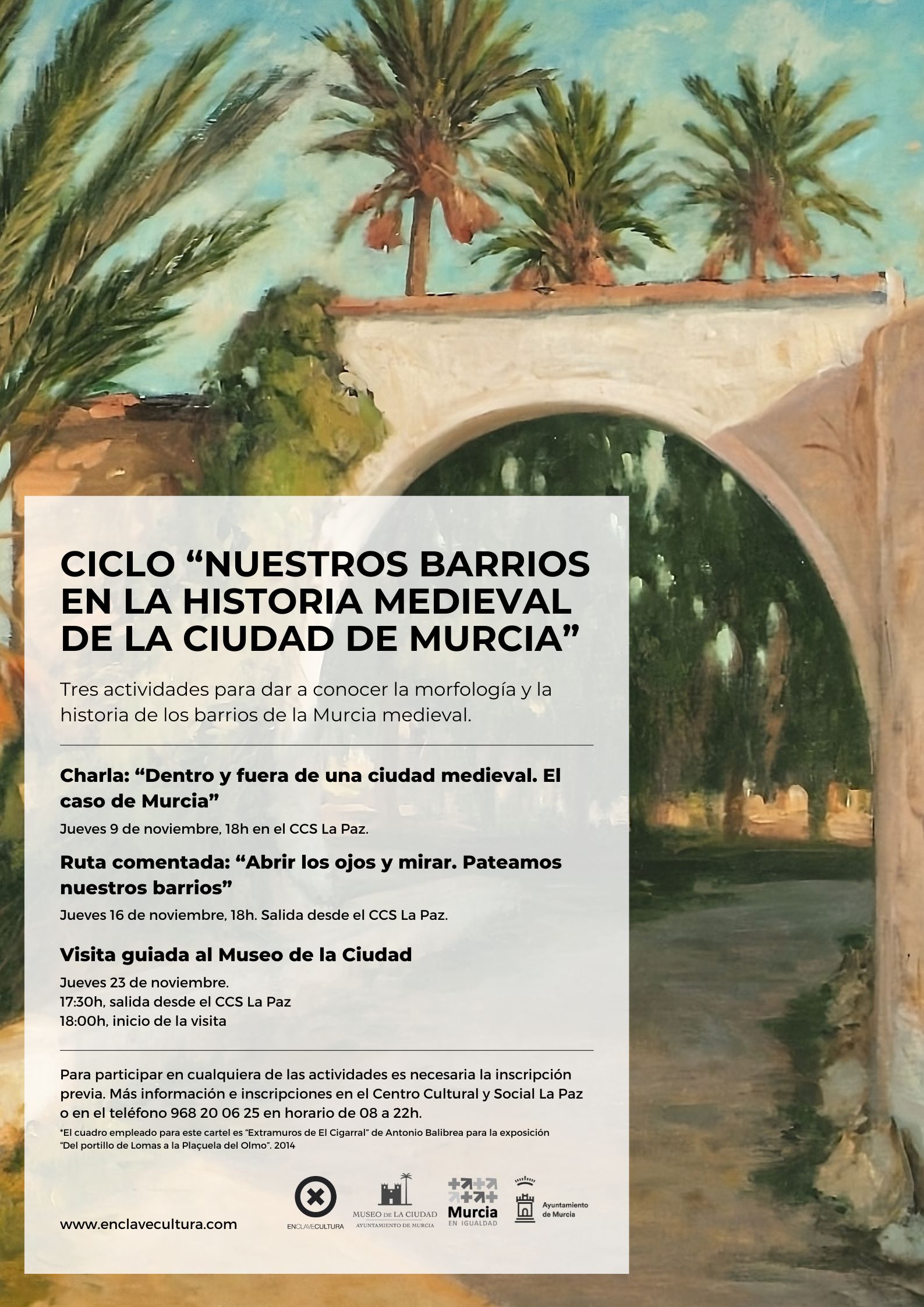 El Ciclo "Nuestros barrios en la historia medieval de la ciudad de Murcia" está conformado por un total de tres actividades a celebrar los días 09, 16 y 23 de noviembre (una charla coloquio, una ruta comentada por el Distrito Este del municipio de Murcia y una visita guiada al Museo de la Ciudad) para las que contaremos con la colaboración de Clara Alarcón, historiadora y técnico de Cultura del Ayuntamiento de Murcia en el Museo de la Ciudad.